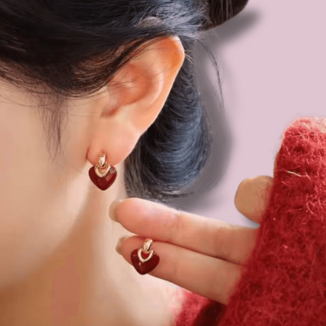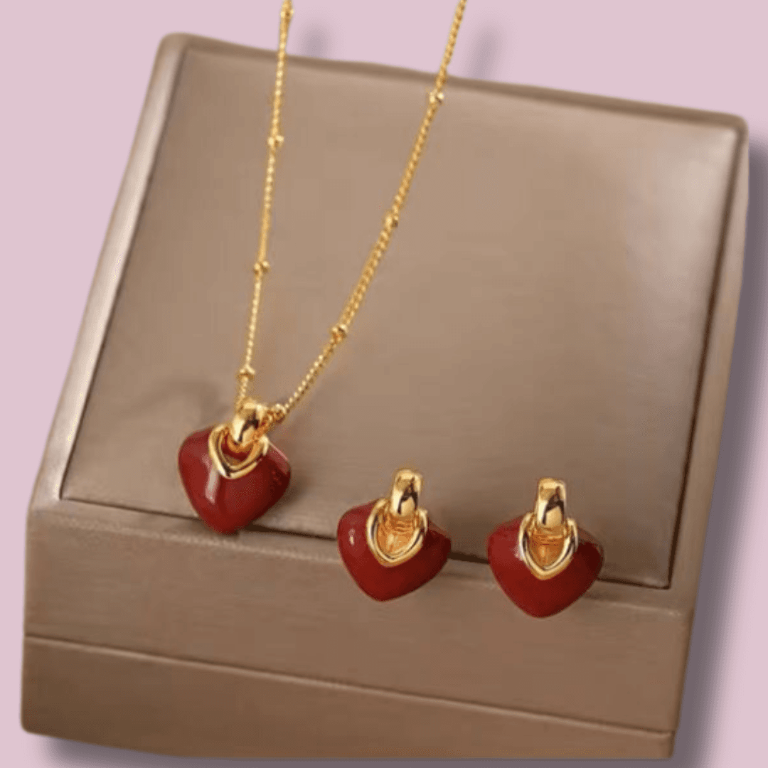 A timeless and elegant jewelry set featuring a necklace and matching earrings, each adorned with a rich red heart design, perfect for weddings, engagements, anniversaries, or thoughtful gifts.