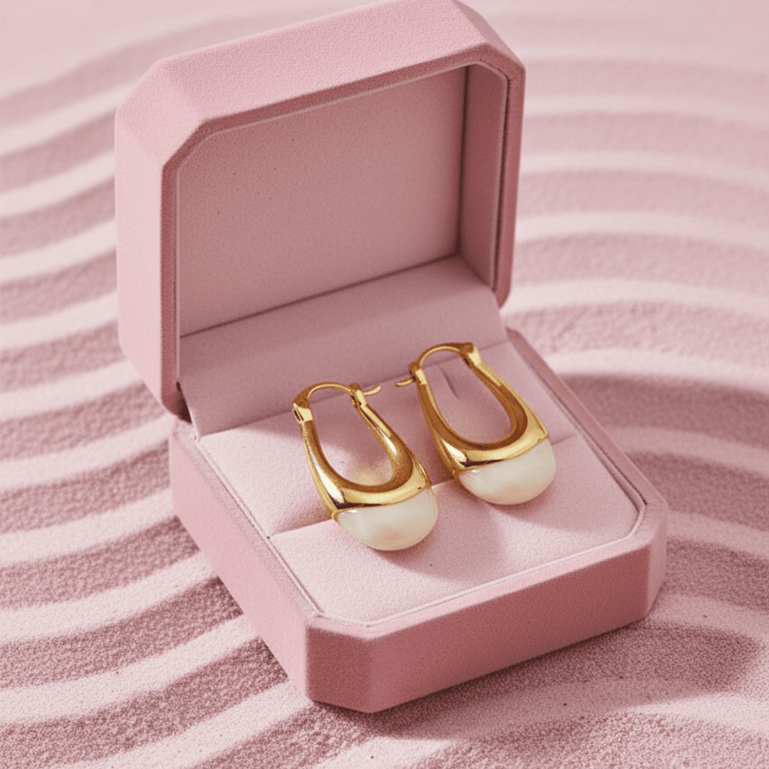 The standout feature is the unique, color-blocked C-shaped design. The top half is a polished gold-plated finish, while the bottom half showcases a smooth, milky white stone with a delicate, opalescent sheen. This contrast creates a bold yet elegant look. The geometric pattern and bezel setting add to their sophisticated appeal. Ideal for a party, night out, or any special event, these earrings are also hypoallergenic, making them a great choice for sensitive ears.
