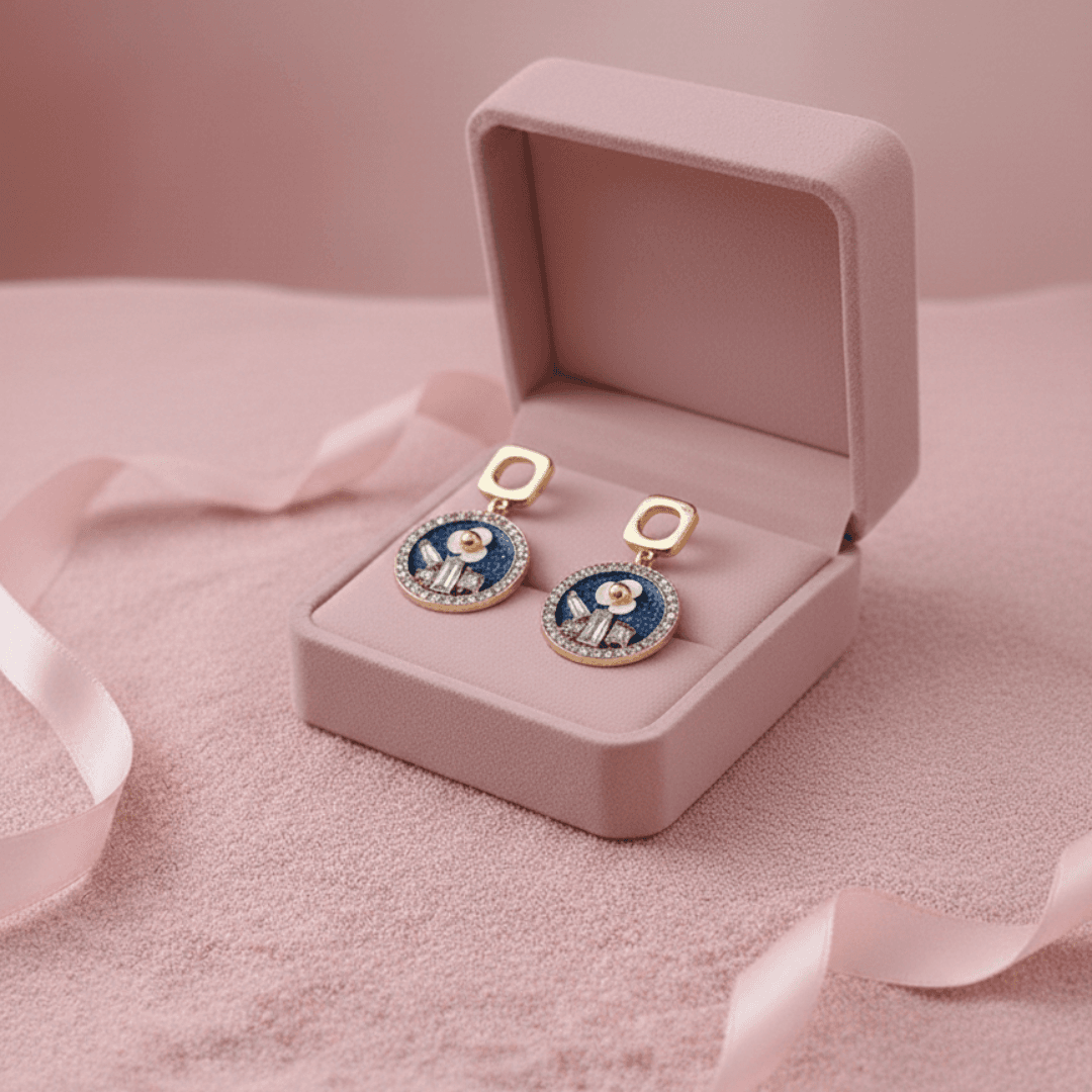 Step out in style with these captivating French Retro Rhinestone Flower Stud Earrings. Inspired by the elegance of vintage design, these earrings combine a bold, modern aesthetic with classic details. The main body features a textured, round disc with a deep blue denim-like finish. On top of this is a stylized white and gold flower, with each petal outlined in gold and accented with sparkling rhinestones. The earrings are topped with a sleek, gold-toned square stud, connecting to the main pendant with a simple ring.