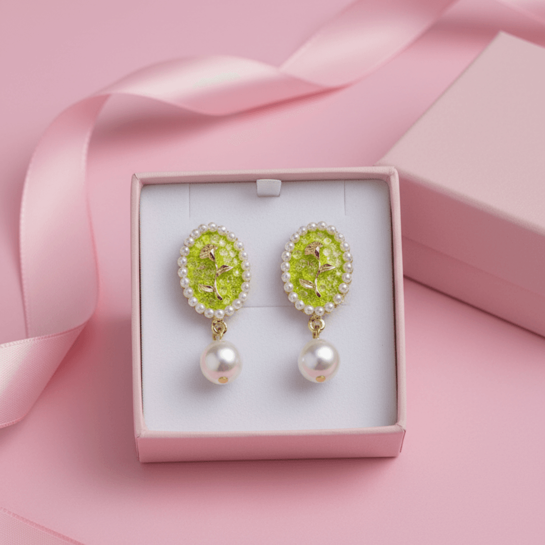 Make a statement with our exquisite Imitation Pearl & Flower Drop Earrings. Perfect for adding a pop of color and vintage elegance to any outfit, these earrings are a must-have accessory. The top portion features an eye-catching oval design with a detailed flower pattern in a subtle gold tone, set against a bright, lime-green, textured background. The face of the earring is encircled by a border of small, lustrous imitation pearls, creating a halo effect.