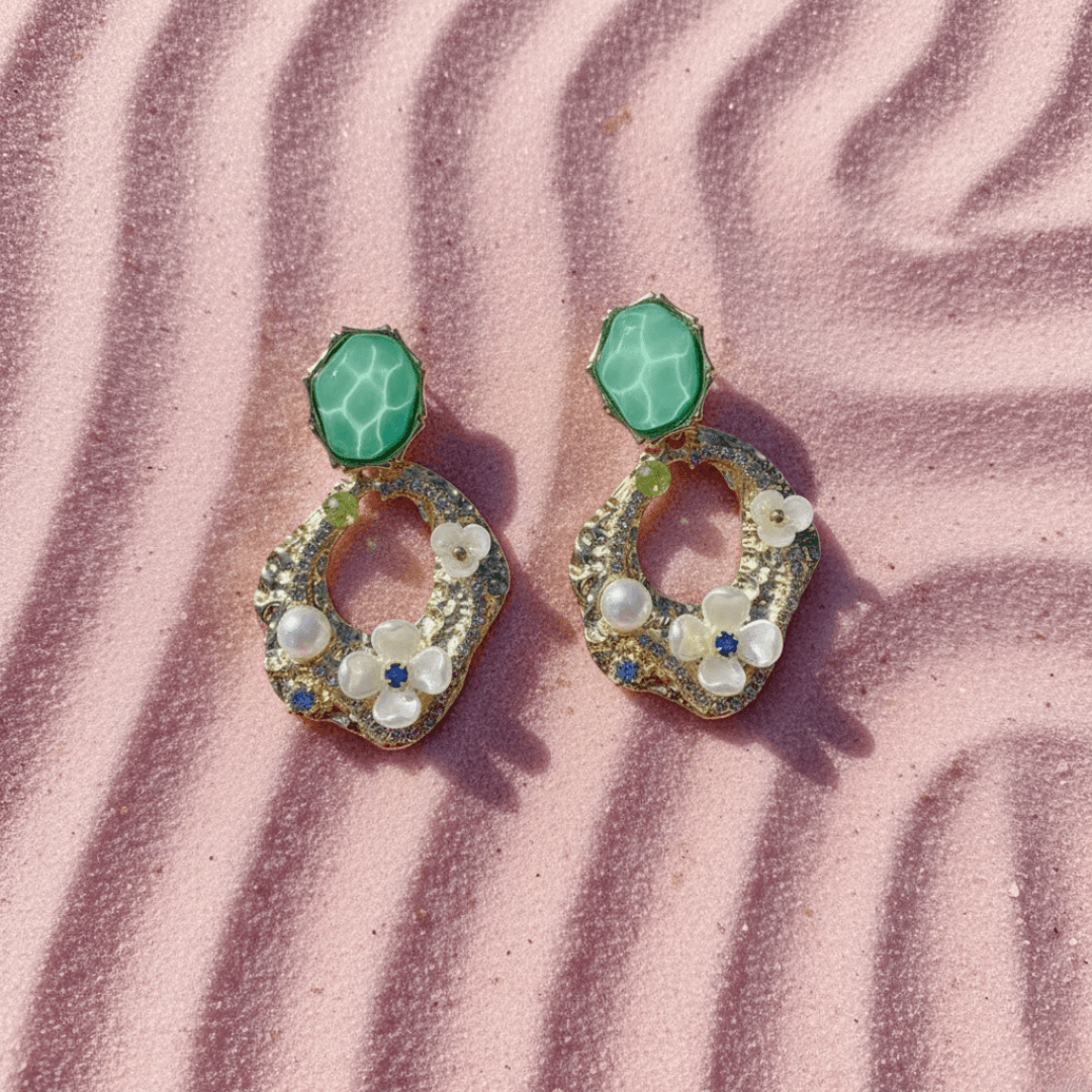 Step into timeless elegance with our Palace Style Gemstone & Flower Drop Earrings. This stunning set is a true work of art, designed to capture attention with its intricate details and luxurious feel. The earrings feature an eye-catching design with a bold, faceted green gemstone stud that connects to a larger, irregular-shaped drop. The drop itself has a beautiful, textured gold finish, adorned with delicate white and blue flowers made of sparkling rhinestones and lustrous pearls.