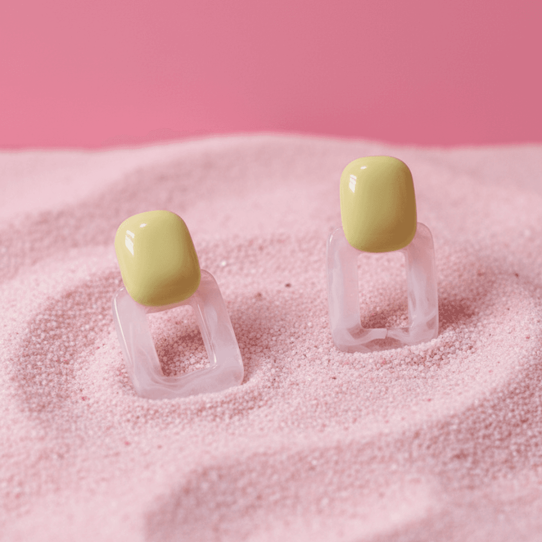 These charming drop earrings feature a lovely, two-toned geometric design with a soft yellow top and a transparent rectangular bottom. Made from lightweight resin, they are a romantic and stylish choice for everyday wear.