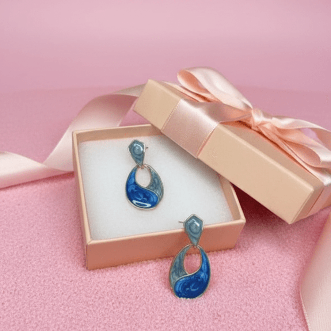 Add a touch of contemporary elegance to your jewelry collection with our Trendy Gold-Plated Geometric Drop Earrings. These beautiful dangle earrings are designed for the modern woman who loves a blend of bold style and delicate details. Each earring features a unique, two-part design with a small, graceful stud on top and a larger, irregular water drop-shaped pendant below. The pendant has a mesmerizing blue enamel finish with an abstract, hand-painted swirl pattern, creating a one-of-a-kind, artistic look.