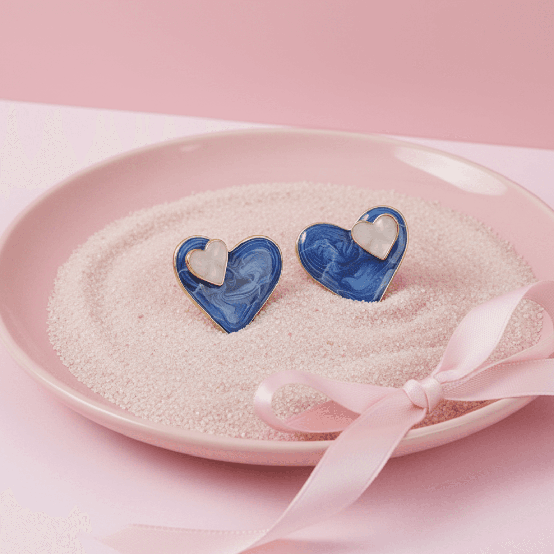 Step into timeless romance with our Vintage French-Style Blue & White Heart Stud Earrings. These exquisite earrings are a testament to classic elegance, featuring a bold, heart-shaped design with a stunning marbled blue and white enamel pattern that gives them an artistic, one-of-a-kind feel. A small, contrasting white heart at the top adds a delicate touch, while the sleek gold-toned frame completes the look.